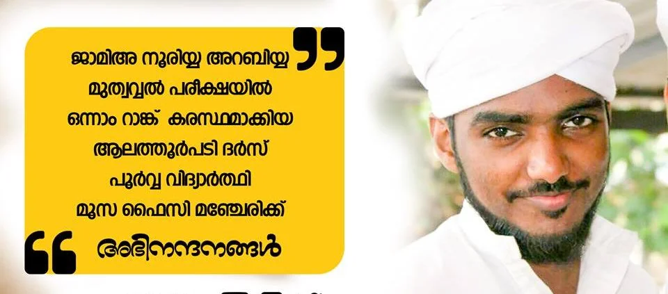 ആലത്തൂര്പടി:2017-18 വര്ഷത്തെ ജാമിഅ നൂരിയ ഫൈനല് പരീക്ഷയില് ഒന്നാം റാങ്ക് കരസ്ഥമാകിയ മൂസ ഫൈസി മഞ്ചേരിയെ ആലത്തൂര് പടി മഹല്ല് കോഡിനേഷന് അനുമോദിച്ചു. സയ്യിദ് ജിഫ്രി മുത്തുകോയ തങ്ങള് ആവാര്ഡ് ദാനം നടത്തി അബ്ദു റഹ്മാന് ഫൈസിയുടെ അധ്യക്ഷതയില് ആയിരുന്നു സംഗമം. […]